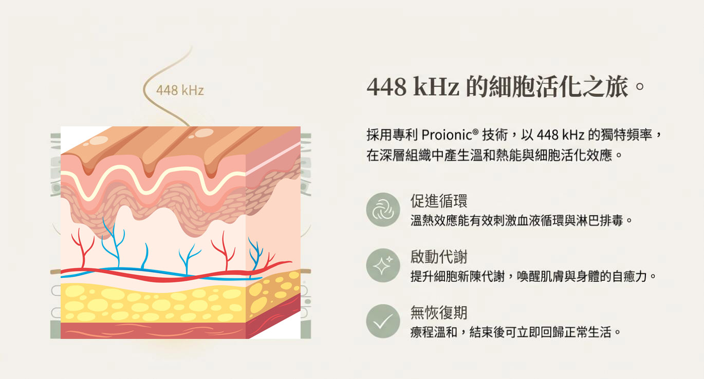 Indiba 英特波 是源自西班牙的非侵入式射頻(Radio Frequency)療程,利用 448 kHz 的專利 Proionic® 技術,在深層組織產生溫熱及細胞活化效應,促進循環、新陳代謝與自體修復。